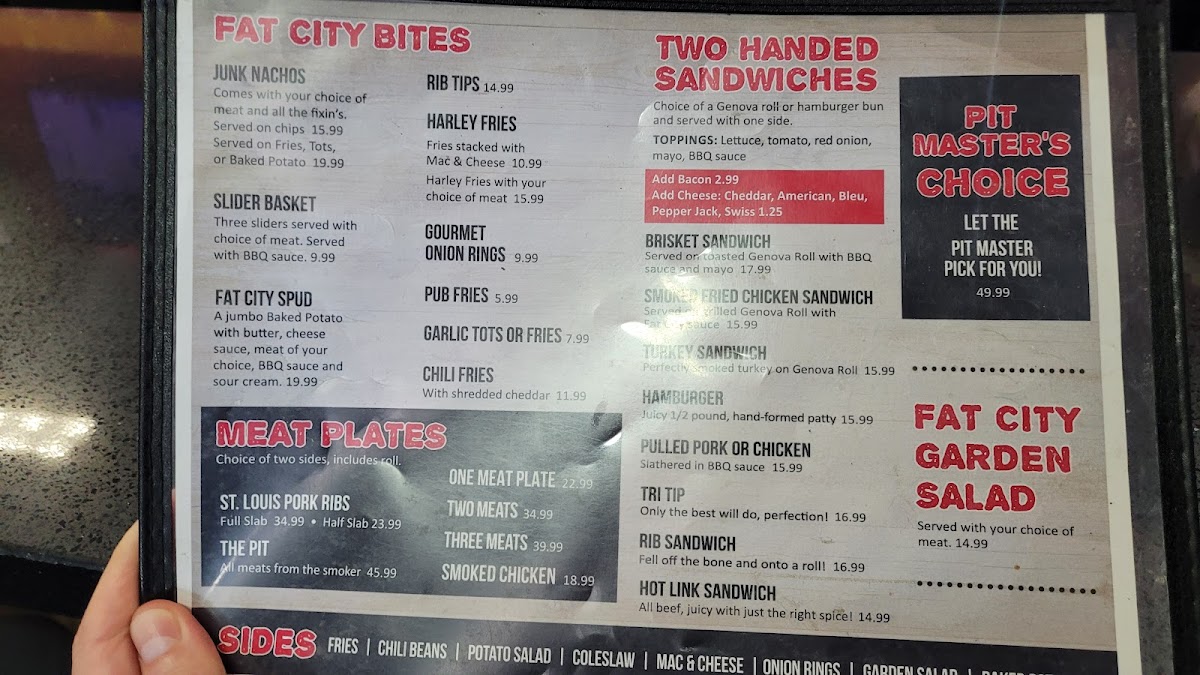 The menu at Fat City is a celebration of barbecue, featuring a range of meat plates that cater to every craving. Indulge in the mouthwatering St. Louis Ribs, available as a half slab for $23.46 or a full slab for $34.80, perfectly smoked and so tender they fall off the bone. If you're feeling particularly adventurous, the Pit All the SMOKED Meats for $45.97 is a generous selection of the day’s finest, showcasing the restaurant's commitment to quality. Pair your meat with delicious sides, and savor each bite.